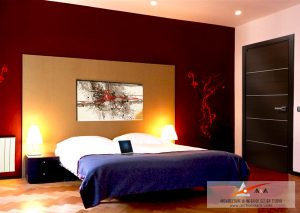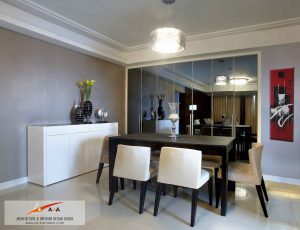 At the other end, the dining room was planned to accommodate a decent number of guests. The required look & feel was set through the clever use of play-off colors paint and incorporated burnt orange and deep beige tones to keep the apartment’s design consistent. The beautiful vases ornament perfectly encapsulate the dining room vibe.